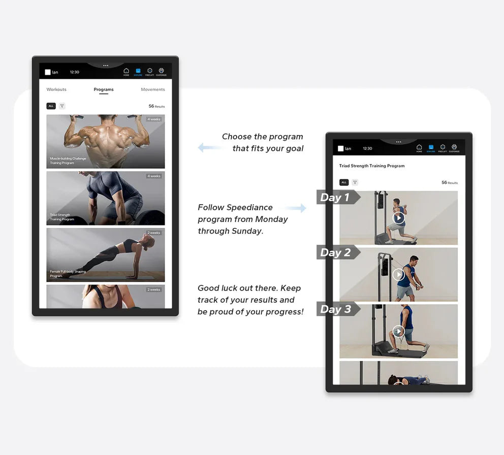 Faites le plein d'énergie et restez sur la bonne voie grâce au programme d'entraînement scientifique de Speediance. Nos plans d'entraînement sont conçus pour équilibrer votre routine hebdomadaire et vous aider à atteindre vos objectifs de remise en forme avec une efficacité maximale.